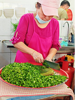 Stall holder was chopping up the fresh vegetables for the lei cha. It's a dish made up of different vegetables with rice, peanut and tofu, etc.